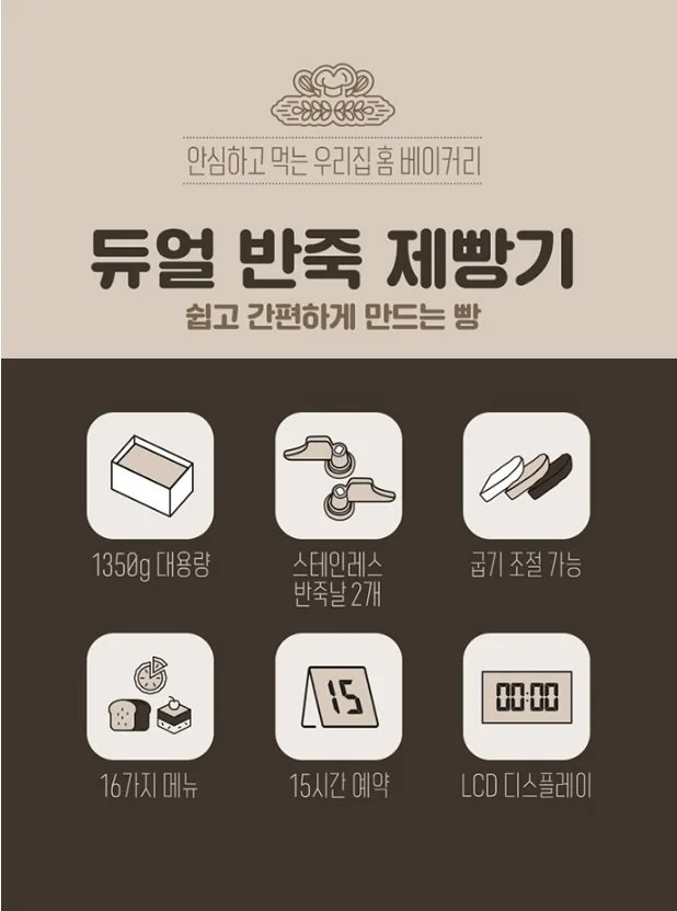 빵은 만든 직후부터 수분이 빠져나가는 노화가 시작되기 때문에 바로 먹을 때 가장 맛이 좋습니다. 듀얼 반죽 제빵기만 있다면 맛있고 건강한 빵을 드실 수 있습니다.